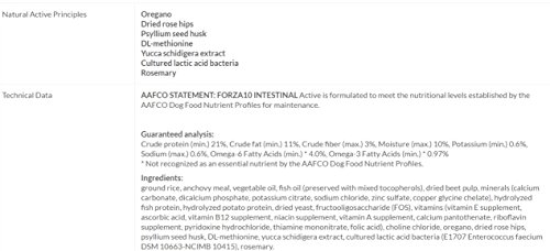The search for a healthy dog food that is effective against gastrointestinal disorders is over. Forza10 USA Intestinal Active is formulated by veterinarians for dogs with digestive issues. Whether you have a large, small, adult, or senior dog, this dry dog food will support the health of your dog's stomach and intestines while giving them the nutrition they need for overall health. Intestinal Active has a short ingredients list to keep the risk of food intolerances and allergic reactions as low as possible. It's grain-free, wheat-free, gluten-free, antibiotic-free, soy-free, corn-free, and non-GMO. You can trust the quality of ingredients in our food, as they meet all the nutritional levels established by AAFCO. Our Active Line of products has been made to solve the most common chronic or recurrent inflammations caused by adverse reactions to food. Forza10 uses wild-caught herring or anchovy in our pet food to bypass the risk of heavy metal contamination. This source of protein has the highest biological value and is easy on the digestive system. Our food has eliminated all possible sources of the antibiotic oxytetracycline, which can become toxic. It has been proven by veterinary and medical scientists to be the most frequent cause of inflammation in cats and dogs--and you won't find any of it in our food. This diet is also enriched by special heart-shaped tablets that carry a pool of specific natural extracts mixed with kibbles in a 7% ratio. Thanks to our Active Fresh System patented technology, these tablets are cold-pressed to preserve the efficacy of the herbal extracts inside them. Our kibble also uses a specific pool of medicinal plants chosen for their antitoxic, antioxidant, and immune-modulating properties to help support the overall health of man's best friend. Intestinal Active is perfect for all dogs and supports their gastrointestinal health. This nutraceutical dog food will help maintain the health of the digestive system.Feature