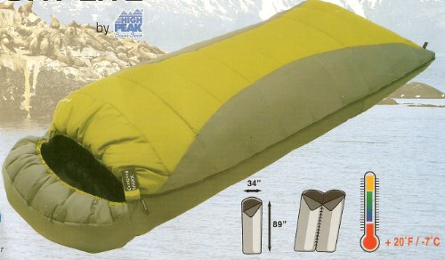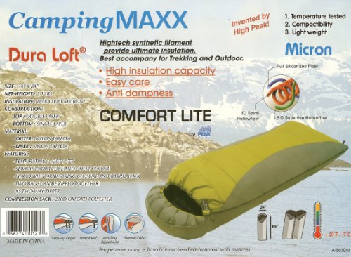 Studio : CampingMaxx Publisher : CampingMaxx Product Description The CampingMaxx Comfort Lite is my choice of a sleeping bag. Although rated to 20 degrees, with one of our $15 liners, this can be comfortable to zero degrees. It measures 34" X 89" and has a head wrap/pillow that can easily be pulled around the head. The full-length zipper has a 2" insulating seal along the entire length. The lining is 100% soft nylon which enables this bag to be used in warm climates or throughout the entire year. The filling is dura loft and the bag weighs in at only 4.1 pounds. Two of these bags may be zipped together to form one giant bed. The stuff sack measures 18" with a 9" diameter. NOTE: The green color in the image is not accurate and we cannot correct it. This is very pleasant lite green color. 0