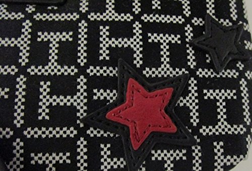 -. Brand : Tommy Hilfiger -. Color : Black / Grey / White -. Department : womens -. Feature : Strap drop: 6 inches / Silver tone hardware; Zip-top; Interior zippered pocket / Jacquard fabric with faux leather trim / Length: 7.75 inches X Height: 4.75 inches X Width: 1 inch -. ProductGroup : Shoes -. ProductTypeName : HANDBAG -. Size : Large -. Title : Tommy Hilfiger Wristlet Star Applique' Stars Monogram Logo TH