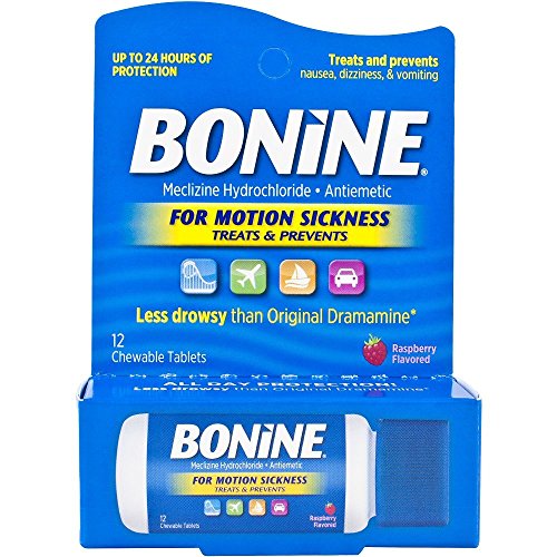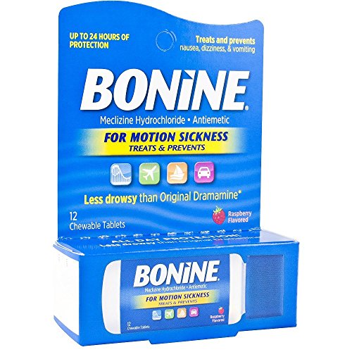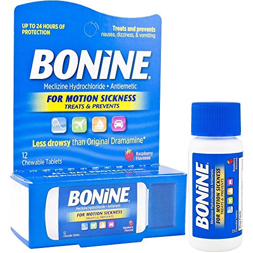 -. Feature : 12 Bonine Chewables in a Traveling Dispenser / Raspberry Flavor / Bonine protects travelers against air, sea and car sickness for up to 24 hours.