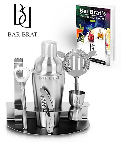 PREMIUM 7 PIECE BAR SET & COCKTAIL SHAKER KIT BY BAR BRAT ™ / FREE 110 COCKTAIL RECIPE (EBOOK) INCLUDED / PRE-BUILT STAINLESS STEEL STAND FOR ALL YOUR BAR PIECES