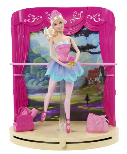 In the new movie Barbie in the Pink Shoes, Barbie stars as Kristyn Farraday, a beautiful ballerina whose magical pink shoes take her into a fantasy world of ballet. While journeying through this delightful world, Kristyn transforms into the beautiful and graceful ballet characters Giselle and Odette. With this practice-to-performance play set, Kristyn can rehearse those roles until she has them down perfectly. She comes with an adorable pink tutu to practice in and a beautiful sparkly costume for the big ballet performance. Plus she can actually dance on the stage! The set includes a removable practice ballet barre, two studio and stage background scenes, a practice skirt, leg warmers, ballet duffle bag and rose bouquet to reward her amazing dancing skills and ballerina grace.