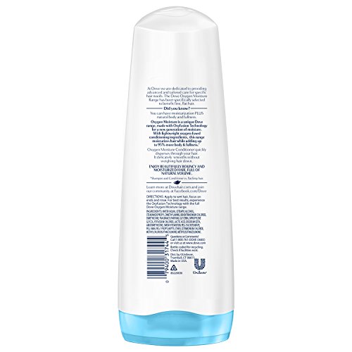 -. Feature : With lightweight, oxygen-fused conditioning ingredients / Conditions and smoothes hair without leaving residue / Provides your hair with moisture and 95% more volume when using Shampoo and Conditioner as a system or other products in the range vs. flat, limp hair / For fine, flat hair / Give your hair volume and bounce / For best results, experience the Oxyfusion Technology with Dove Oxygen Moisture Shampoo and the full line of products / Enjoy beautifully bouncy and moisturized hair, full of natural volume / Made with lightweight oxygen-fused conditioning ingredients / Moisturizes for instant smoothness without weighing hair down, for fine-flat hair / Learn more about the dove range of oxygen moisture products at dovehair.com and join the community at facebook.com/dove
