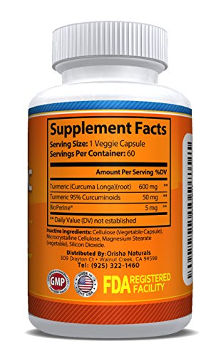 -. Binding : Health and Beauty -. Brand : Orisha Naturals -. EAN : 0643131997742 -. Feature : TURMERIC is a natural product that may be one of the most effective nutritional supplements in existence / CURCUMIN is the naturally occurring active compound which is believed to have many positive health benefits. We enrich our Turmeric with Curcumin / Turmeric can help relieve joint pain by reducing inflammation / We add BioPerine® (Black Pepper extract) so that your body can efficiently absorb more of the active ingredient, Curcumin / 100% money back GUARANTEE. Made in the USA -. IsAdultProduct : 0 -. Label : Orisha Naturals -. Manufacturer : Orisha Naturals -. MPN : TCP60 -. PackageQuantity : 1 -. PartNumber : TCP60 -. ProductGroup : Health and Beauty -. ProductTypeName : HEALTH_PERSONAL_CARE -. Publisher : Orisha Naturals -. Studio : Orisha Naturals -. Title : Turmeric Curcumin, 100% All Natural with Bioperine for Optimal Absorption, Anti-inflammatory Supplement -. UPC : 643131997742