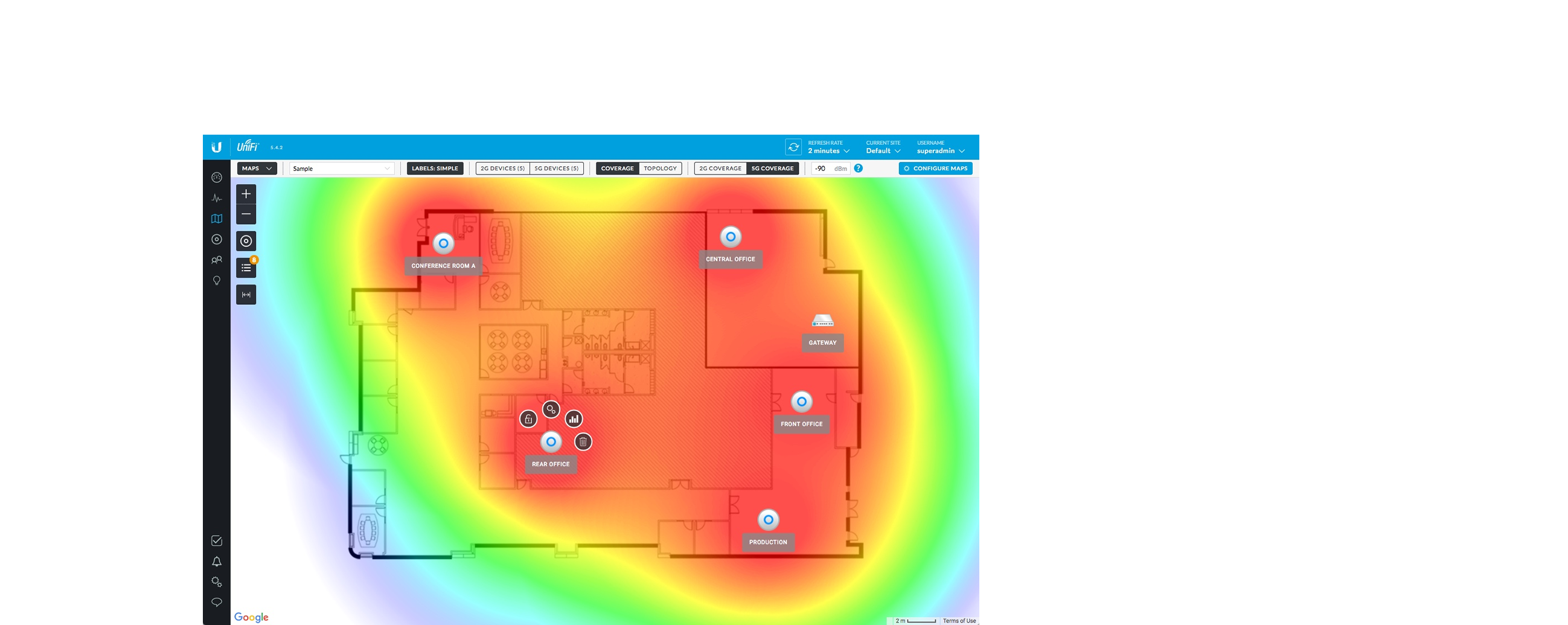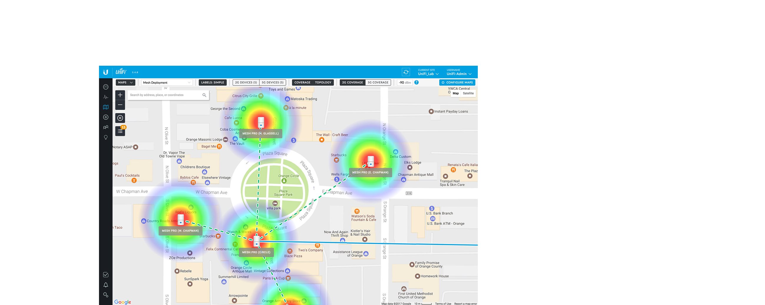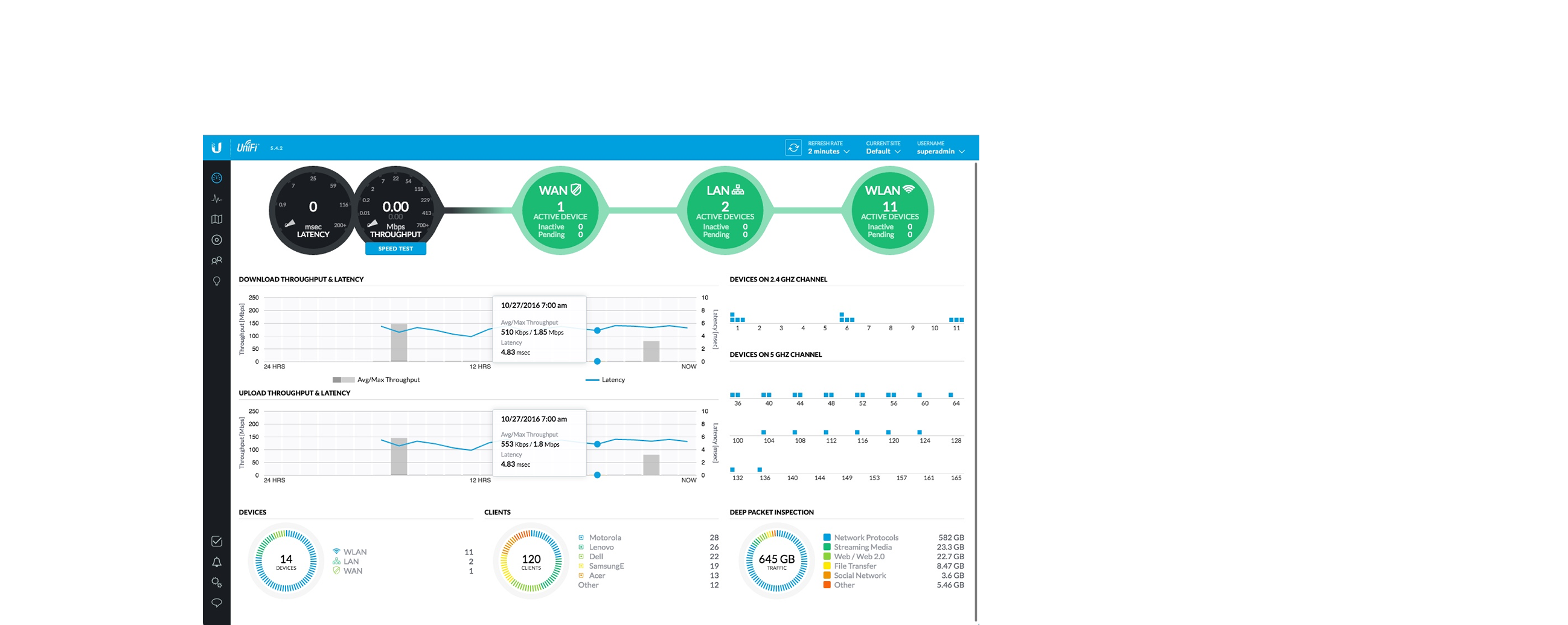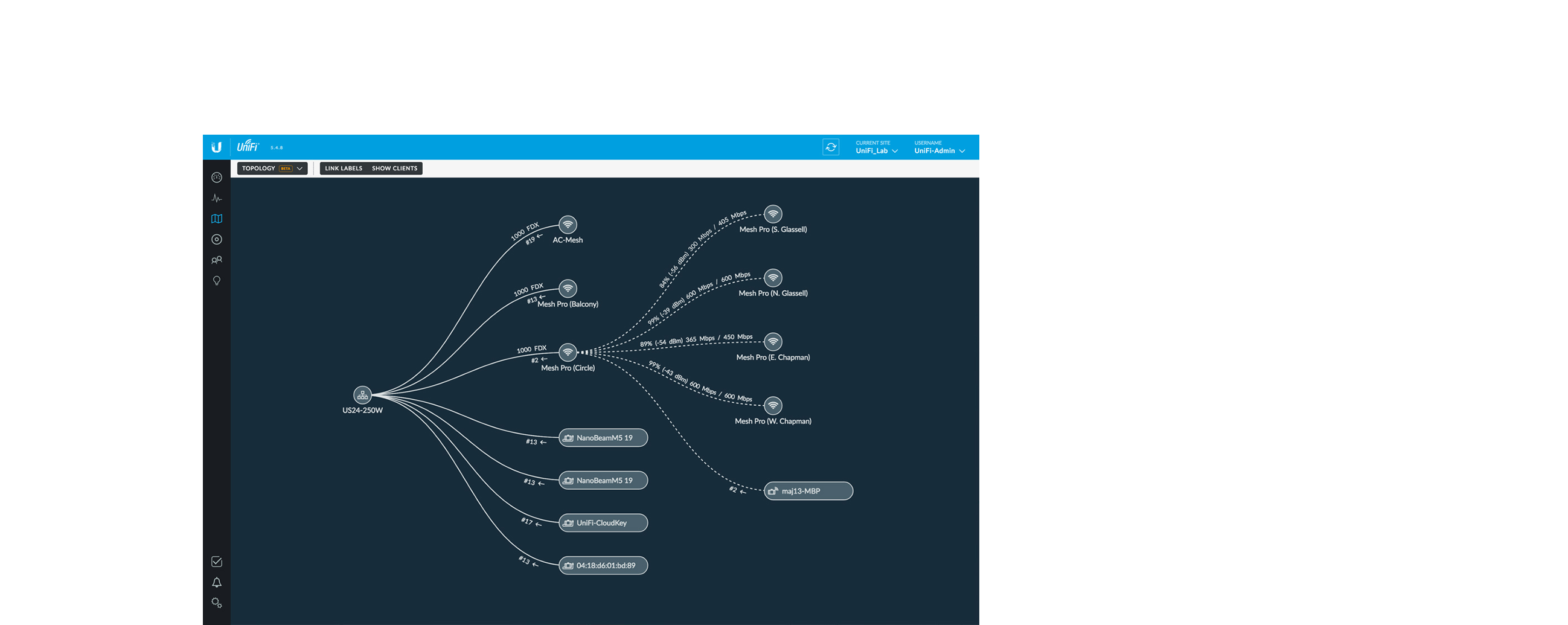 A single instance of the UniFi Controller running in the cloud can manage multiple UniFi sites within a centralized interface. Each site is logically separated and has its own network monitoring, configuration, maps, statistics, and admin accounts.