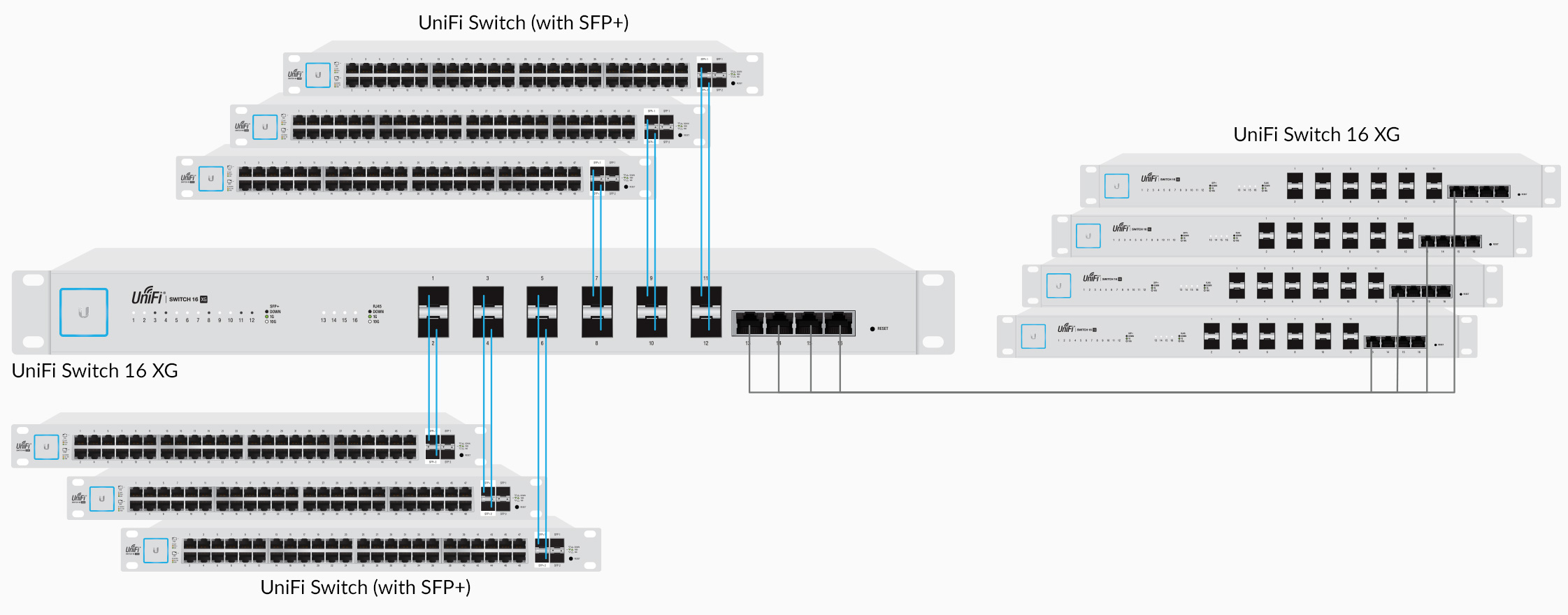 Supports 12 x US-48, 10 Gbps symmetric (40 Gbps aggregate) uplink/downlink and 4 x 10 Gbps Ethernet for uplink to another US-16-XG or core server.