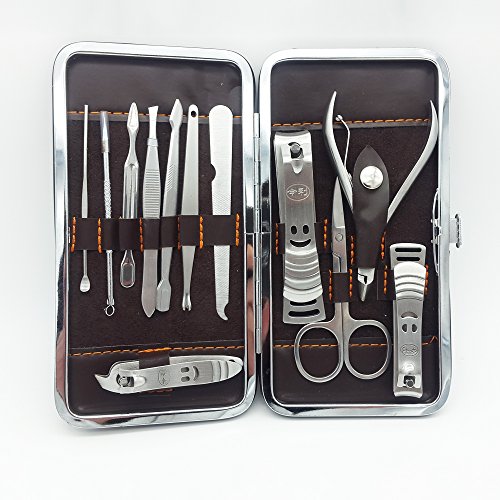 12 Pcs of manicure tools, including 3 nail clippers / trimmers of different sizes, 1 multipurpose scissors, 1 pliers, 1 ear pick, 1 cuticle trimmer, 1 eyebrow tweezer, 1 cuticle knife, 1 nail file, 1 acne needle, and 1 dirt cleaning suppository.