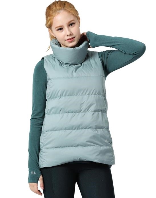 덕 다운 충전재를 사용하였으며 목을 보호해주는 숄카라로 한층 더 우수한 보온성을 느낄 수 있는 베스트입니다.