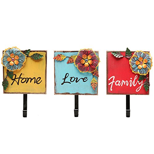 - Set of 3 wood-and-metal garment hooks with colorful painted finishes (in red, yellow, and blue) and tropical-themed metal flowers, as well as the words "Family," "Home," and "Love."