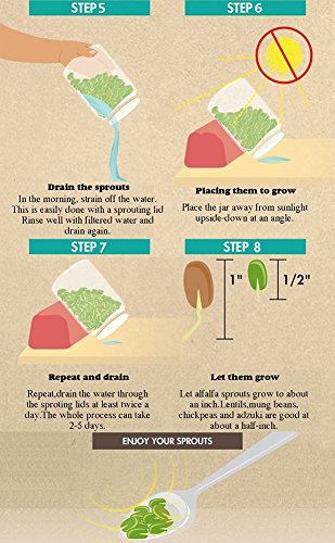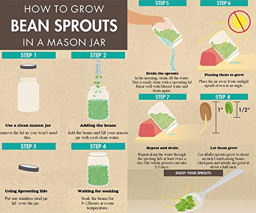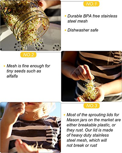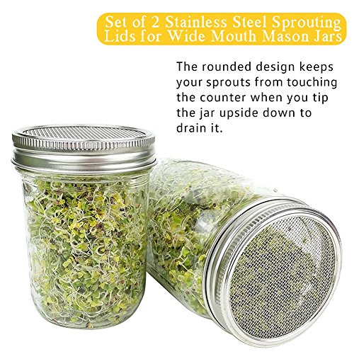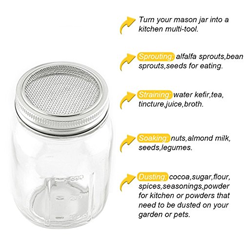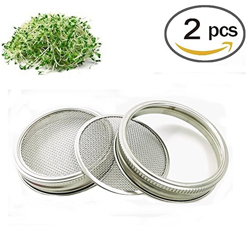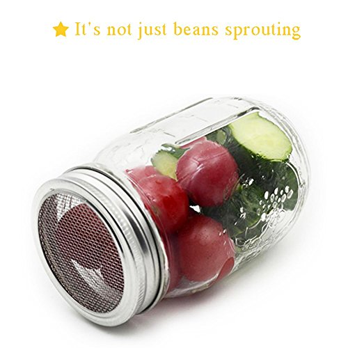 Stainless Sprouting Jar Lid Kit Turn your mason jar into a kitchen multi-tool! Size: WIDE MOUTH At home, not only can you grow fresh buds, enjoy healthy green food, But also Straining:tea, tincture, juice, broth Soaking:nuts, almond milk, seeds, legumes Dusting:cocoa, sugar, flour, spices, seasonings, powder for the kitchen or any powder that need to be dusted on your garden, or pet Keeping the sprouts well-aerated and always edible ?Sprout Jar Lids "Jar Method"Sprouting Instructions For a quart-sized jar, start with 1 1/2 table spoons seeds inside the jar, screw on the fine mesh sprouting lid and partially fill the jar through the sprout jar lids with warm water, not hot Swirl it around to clean the seeds, then pour out. Refill with warm water to cover at about 3 times their depth let soak overnight, away from light. This gets the germination process started Pour off the soak water. Find a location that is not exposed to direct sunlight. Place drained jar propped at angles?allow any extra water to drain out. Turn the jar to spread out the seed. Cover the jar with the sprout jar lids and a dishtowel and leave for 3 to 4 hours. Rinse sprouts with cool, fresh water 2 or 3 times each day until they are ready to eat or refrigerate. When they begin to throw off the seed hulls, let the jar with sprout jar lids installed overflow with the water and the hulls will float out the top through the sprouting lid screen. Turn the jar to spread out the seed each time you rinse Pour the sprouts into a pan or sink of clean water. Skim off any remaining hulls that float to the surface. Other hulls will fall to the bottom of the container. Pull out the sprouts, gently shake off excess moisture and drain in a colander Special attention: Do not place them in salt water, and keep dry. Please contact us if you have any problem 0 |