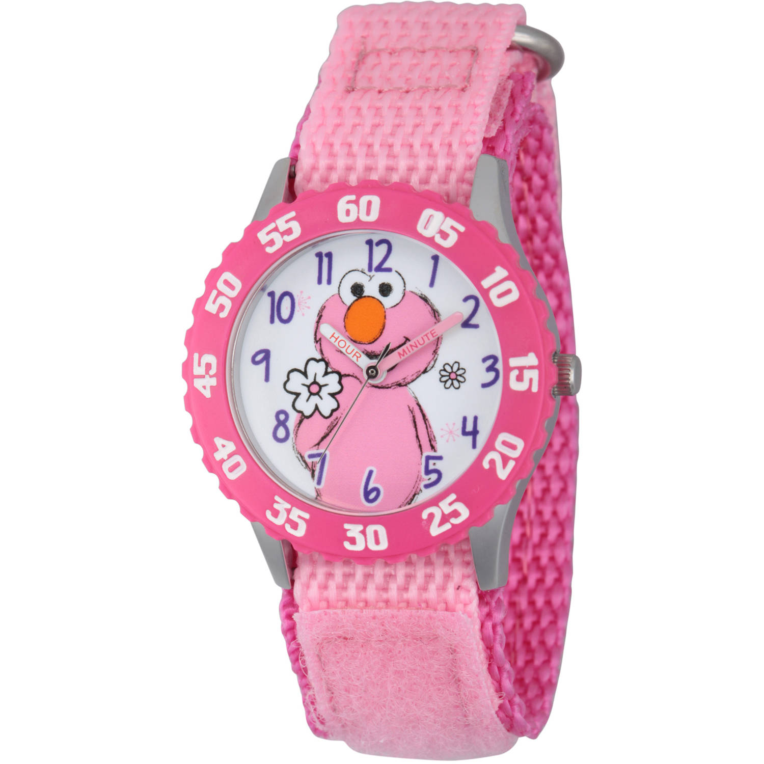 This Sesame Street Girls Stainless Steel Time Teacher Watch features a pink bezel and pink hook and loop nylon strap. Sesame Street Elmo Girls Stainless Steel Time Teacher Watch, Pink Bezel, Pink Hook and Loop Nylon Strap:
