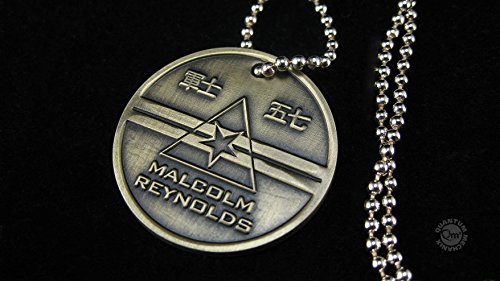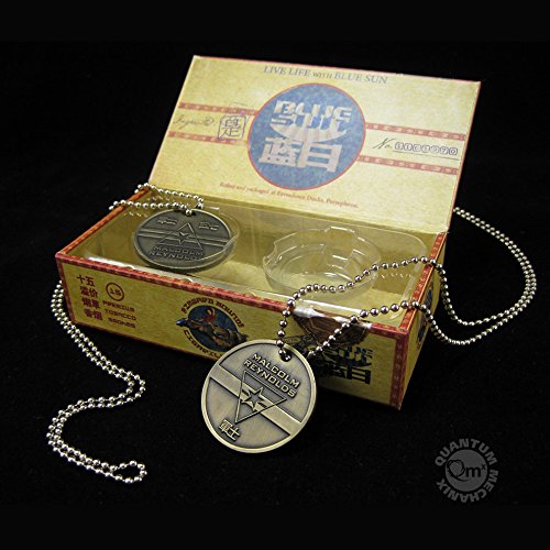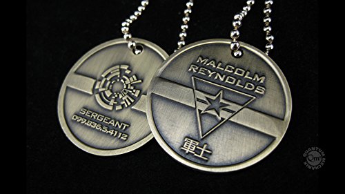 Studio : Quantum Mechanix Inc. Publisher : Quantum Mechanix Inc. Binding : Toy Product Description We have for you a relic of that early 26th century conflict - the Unification War between the ruling Alliance and secessionists known as the Independents.These are the dog tags of Sergeant Malcolm Reynolds, who fought alongside Corporal Zoe Alleyne in the Battle of Serenity Valley.The zinc alloy dog tags with a bronze-like finish feature the logo of the Independents Army: a downward-pointing triangle surrounding an upward-pointing star. But an upside-down version of the logo also appeared onscreen. Firefly costume designer Shawna Trpcic says it was unintentional - a wardrobe boo-boo.But we saw it as a boo-boo with creative potential.So, our set of tags incorporates both logos. It made sense to us that the tag with the original logo would go to the family when a soldier is killed. The tag with the upside-down logo (an upward-pointing triangle surrounding a downward-pointing star), we surmised, would remain with the soldier's body.At the top of the tag's face are Chinese characters for soldier and for the numbers 5 and 7 signifying the 57th Overlanders Bridade, to which Malcolm Reynolds belonged.The flip side of the tag has a sort of 26th century QR code. Beneath that is Malcolm Reynolds' rank and his serial number. The set of two tags come with ball-chain necklaces and are cleverly packaged in a specially designed Blue Sun cigarillo box. 0