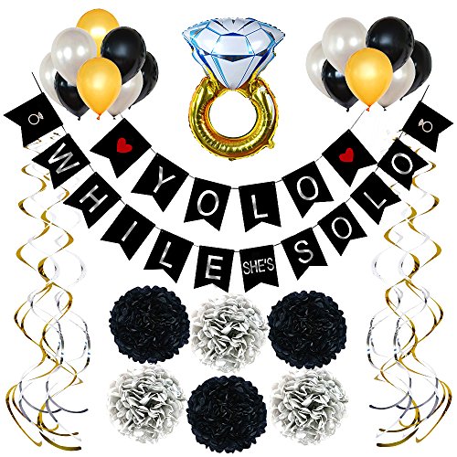 - 💍 MAKE AN EPIC PARTY WITH THIS BACHELORETTE PARTY KIT- The Bachelorette Party Decorations Include: 1 X “YOLO – WHILE SHE'S SOLO” Bachelorette decorations gold banner -Black Cardstocks and Gold Letters- THE ONLY ONE ON AMAZON! 15 Balloons - Black and Silver Balloons / Gold Balloons. 1 X Huge Diamond Ring Mylar Balloon 33 . X 21.25 8 X Swirls 4 Gold And 4 Silver Comes with Hangers and Strings 6 X 8 Tissue paper Pom Poms 3 Black 3 Silver all in 1 Box