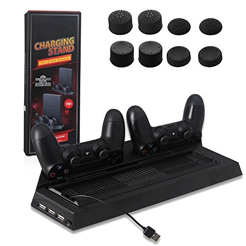 -. Feature : All-In-One: PS4 console and PS4 Slim Conlose vertical stand+ cooler+ dual shock charging Station+ USB HUB / Dual Cooler Fans: Keep your Playstation 4 Slim cool and calm with the vertical cooling stand. No need to worry about your PS4 / PS4 Slim overheating and burning your table from long hours of game play / Dual Charging Station : Charging station with 2 charger ports to charge both of your PS4 shock controllers simultaneously , saving your time when need to charge the controllers / Space Saving Design: Normally your ps4 sits horizontal taking up space within your room. However, with this vertical stand, your ps4 now stands vertically, saving you lots of room space while cooling your PS4 / PS4 Slim at the same time / Multifunctional: 2 HUB and 1 USB ports with powerful output for data transferring and charging for PS4