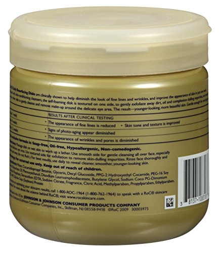 -. Binding : Misc. -. Brand : RoC -. Feature : Dual-textured cleansing pad with skin-nourishing cleansers / Clinically shown to diminish the appearance of fine lines and wrinkles, and improve the appearance of skin in just 1 week / Gently cleanses and removes make-up around the delicate eye area / After 4 weeks signs of photo-aging appear diminished / After 12 weeks the appearance of wrinkles and pores is diminished -. Label : RoC -. Manufacturer : RoC -. MPN : 108318 -. PackageQuantity : 1 -. PartNumber : 108318 -. ProductGroup : Beauty -. ProductTypeName : BEAUTY -. Publisher : RoC -. Studio : RoC -. Title : ROC Daily Resurfacing Disks, 3-inches