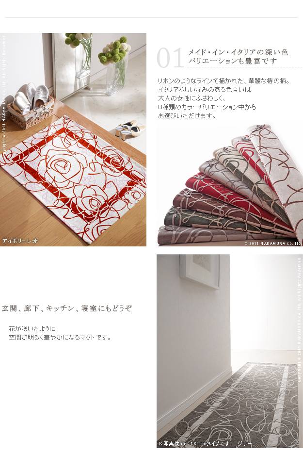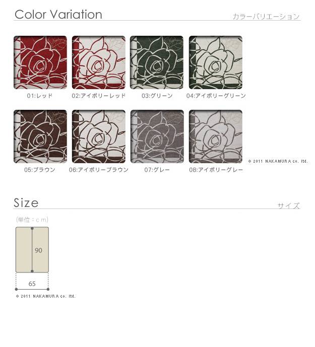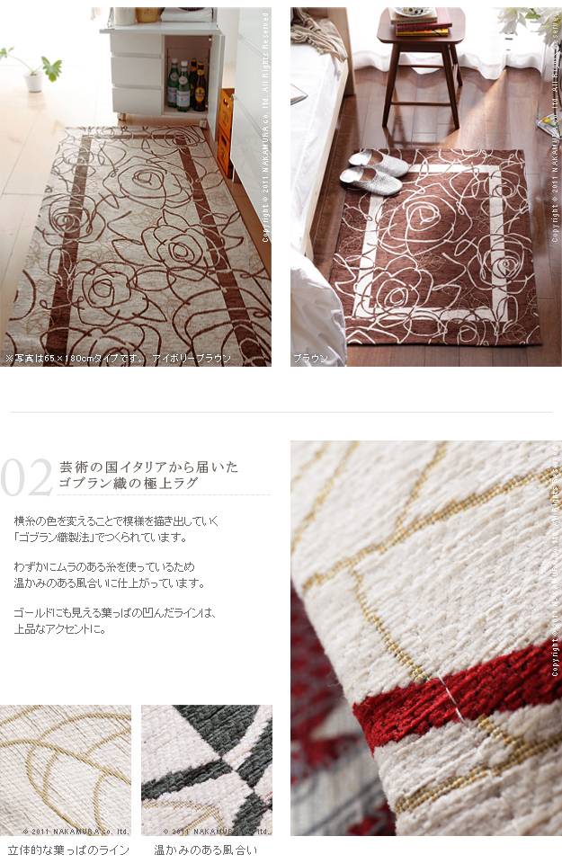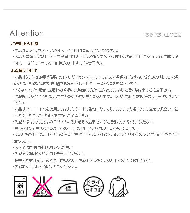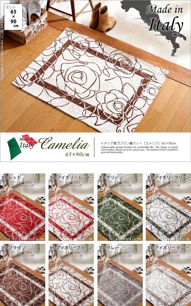 ●商品について:カメリアが描かれたゴブラン織の上品なやわらかいマット。織物らしいフラットな質感と短い毛足で一年中さらさら。全面滑り止め加工でお子様からお年寄りまで足元安心♪洗濯可。床暖房・ホットカーペット対応。
