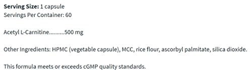 -. Binding : Health and Beauty -. Brand : NeuroBiologix -. Feature : Acetyl L-Carnitine may improve athletic performance, preserve cell energy (support mitochondria)* / May provide support for memory and cardiovascular health* / Carnitine plays a critical role in energy production. It transports long-chain fatty acids into the mitochondria so they can be oxidized ("burned") to produce energy. / This formula meets or exceeds cGMP quality standards. / Serving size: 1 capsule. Servings per container: 90 -. IsAdultProduct : 0 -. Label : Neurobiologix -. LegalDisclaimer : May not sell to anyone under the age of 18. If pregnant or breastfeeding consult with your healthcare professional before use. -. Manufacturer : Neurobiologix -. MPN : N2094 -. PackageQuantity : 1 -. PartNumber : N2094 -. ProductGroup : Health and Beauty -. ProductTypeName : HEALTH_PERSONAL_CARE -. Publisher : Neurobiologix -. Studio : Neurobiologix -. Title : Neurobiologix Acetyl L-Carnitine (500 mg, 90 vegetable capsules)