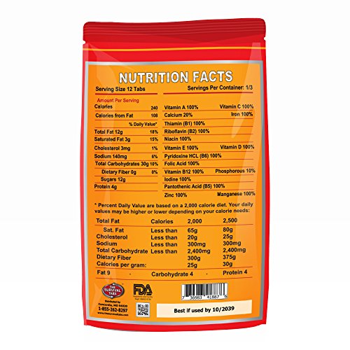 The 'Just in Case' Food Supply, The Survival Tabs backup for the situations such as natural disasters. This is the best possible food in the smallest possible volume. Created to supply the body with all the daily essential vitamins and minerals needed when facing uncertainty. The compact design allows for easy storage and is perfect for individual emergency kits.