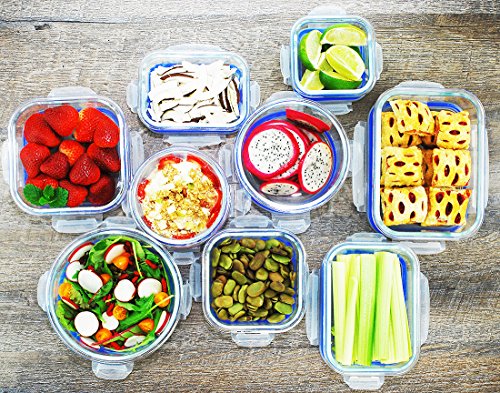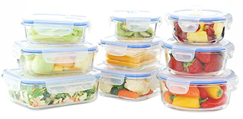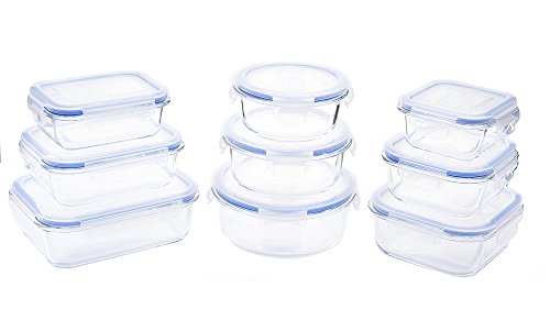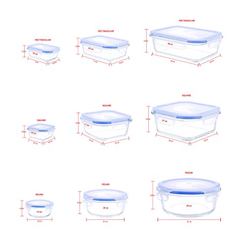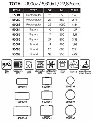 Set includes 3 Rectangular Glass Containers and 3 Plastic Lids: 1-12oz, 1-22oz, 1-36oz. Set includes 3 Round Glass Containers and 3 Plastic Lids: 1-14oz, 1-20oz, 1-32oz. Set includes 3 Square Glass Containers and 3 Plastic Lids: 1-10oz, 1-17oz, 1-27oz
