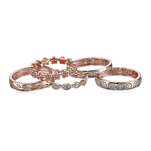 -. Binding : Jewelry -. Brand : Amazon Collection -. Color : White -. Department : womens -. Feature : Mix and match these 5 bands for any occasion / All our diamond suppliers confirm that they comply with the Kimberley Process to ensure that their diamonds are conflict free. / Imported -. Label : Amazon Curated Collection -. Manufacturer : Amazon Curated Collection -. Model : T30189DISSR-Parent -. MPN : T30189DISSR-Parent -. PartNumber : T30189DISSR-Parent -. ProductGroup : Jewelry -. ProductTypeName : FINERING -. Publisher : Amazon Curated Collection -. Studio : Amazon Curated Collection -. Title : 14k Rose Gold Over Sterling Silver Five Diamond Rings Set (1/10 cttw, I-J Color, I2-I3 Clarity)