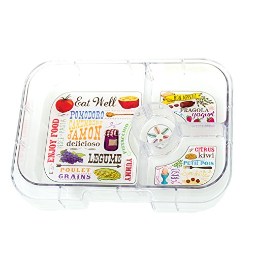 Perfect for kids and adults! 4 compartments (total volume 3 cups plus dip): One 2 cup portion for sandwich/salads, Two 1/2 cup sides, One 1 oz dip/treat well. Illustrated "Eat Well" Tray.