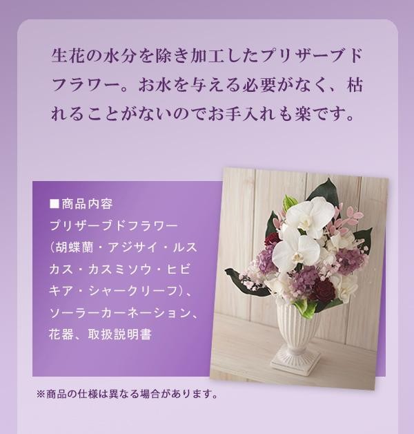 | 白と薄い紫を基調としたデザインで、お仏壇などのお花としてお使い頂けます。お盆、お彼岸のお供えとしてもおすすめです。プリザーブドフラワーなので、水換え不要!!新鮮な生花の色合いで長持ちします。 |