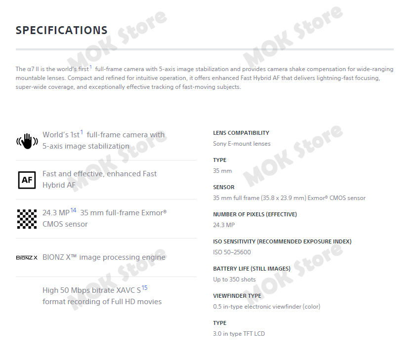 | Battery | 1x NP-FW50 Rechargeable Lithium-ion Battery Pack 1020 mAh |