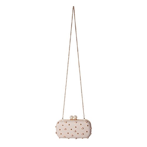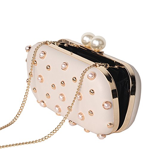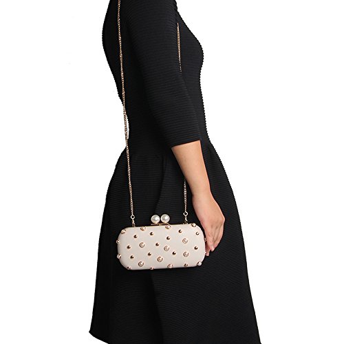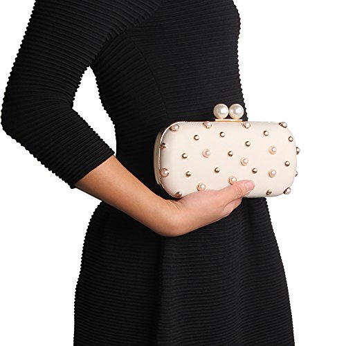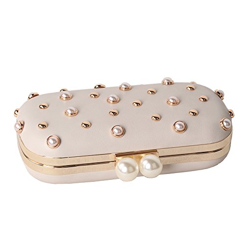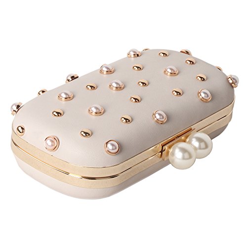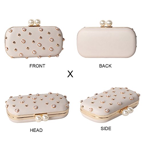 -. Title : M10M15 Women Beige Hard Case Evening Handbags Clutch Purse Wallet for Wedding Party with Pearls and Studs