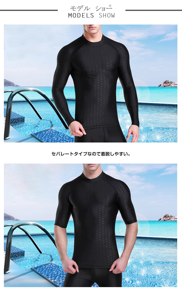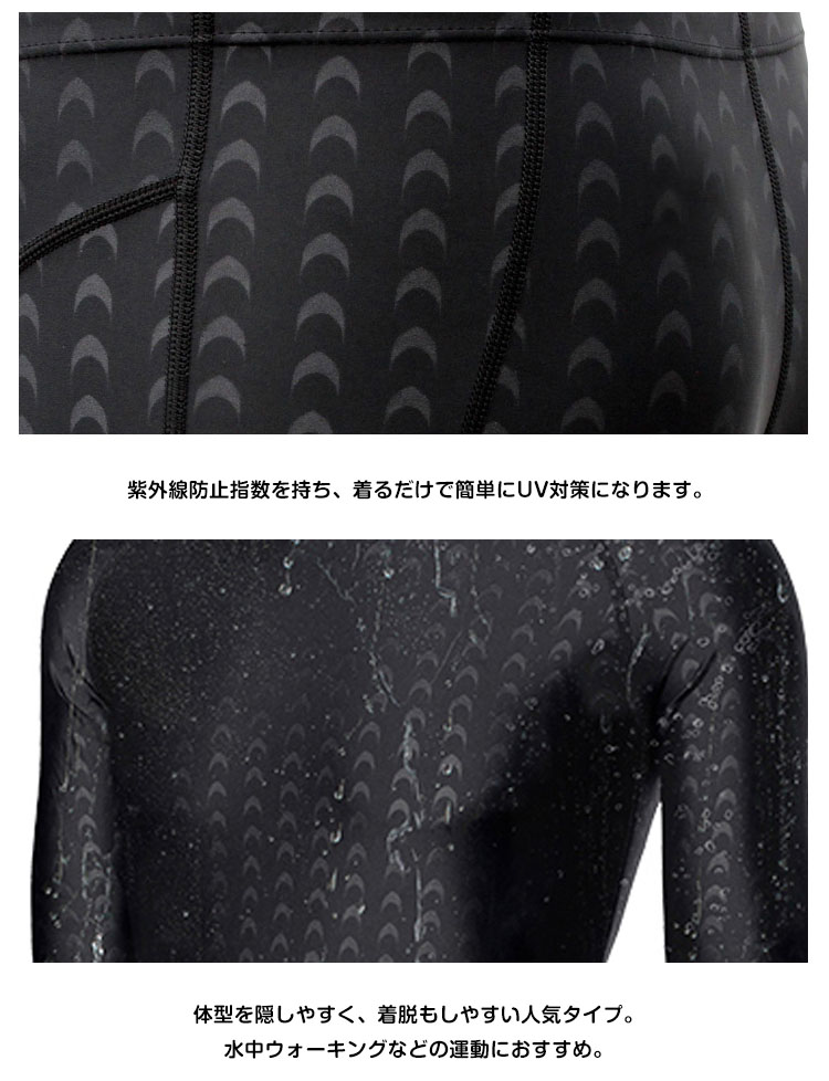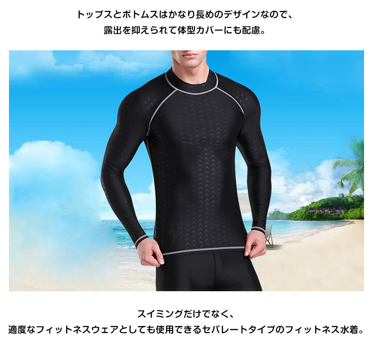 | セパレートタイプなので着脱しやすい。トップスとボトムスはかなり長めのデザインなので、露出を抑えられて体型カバーにも配慮。スイミングだけでなく、適度なフィットネスウェアとしても使用できるセパレートタイプのフィットネス水着。 | |