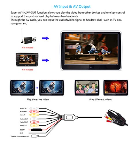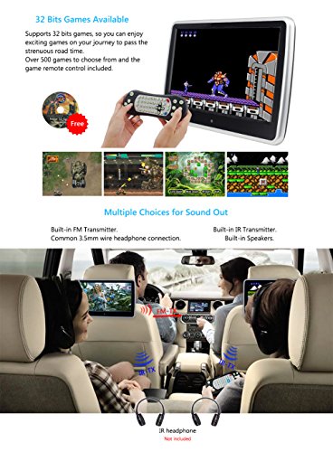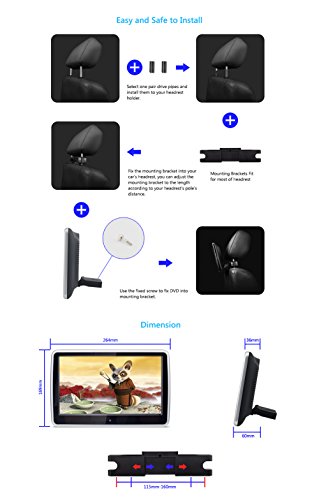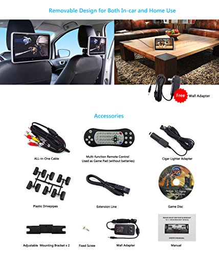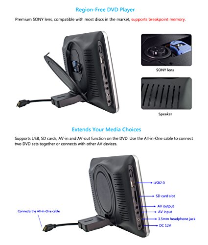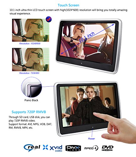-. Feature : 10.1 inch 1024*600 pixel LCD touchscreen, comes with breakpoints memory function / Different types of drive pipes for your headrest's pole while one adjustable mounting bracket provided to meet your need / Removable Design for both in-car and home use also a portable dvd (Wall Adapter included) / Premium Sony lens, compatible with most discs in the market such as DVD VCD MP4 RMVB CD-R CD-RW SVCD DIVX except blu-ray disc / Built-in 2.0 USB port, SD/MMC card slot, FM, IR transmitter, AV in/out, comes with a game disc