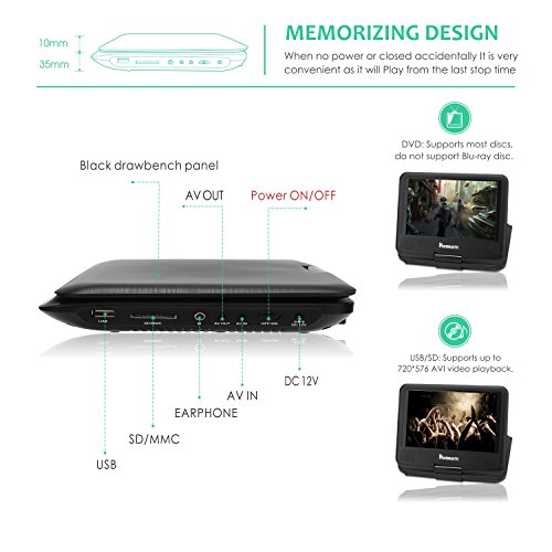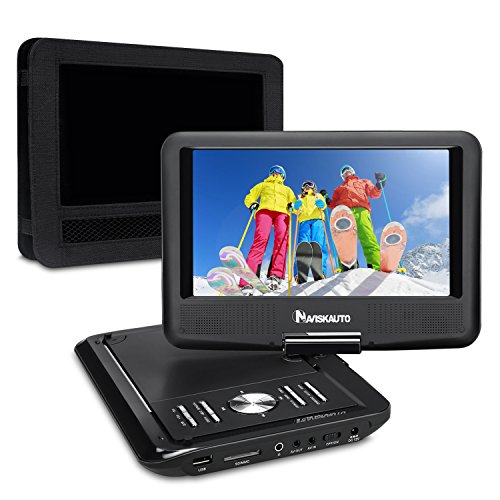 NAVISKAUTO 9 Inch Portable DVD/CD Player USB/SD Card Reader with 5 Hour Built-In Rechargeable Battery, 270° Swivel Screen, 3m AC/DC Adapter and Customized Car Headrest Mount Case (Black)