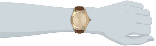 - Feature : Round dress watch with brown leather band featuring gold-tone dial and bezel / Japanese-quartz movement with analog display and protective synthetic-sapphire crystal dial window / Features gold-tone hour markers and hands / Features buckle closure / Water resistant to 99 feet (30 M): withstands rain and splashes of water, but not showering or submersion