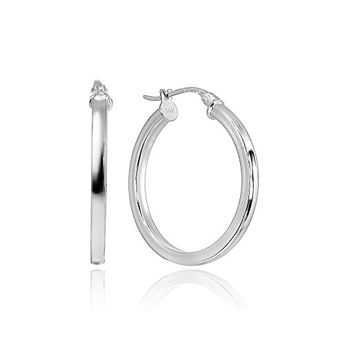 High polished earrings display square-tube round hoops with click-top closures. Choose the diameter size that suits you style. The hoops are crafted of sterling silver and are nickel free.