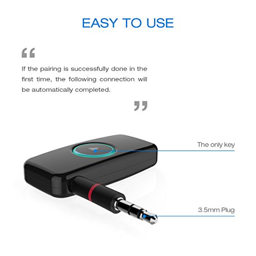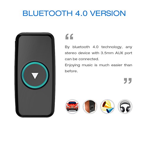 - Feature : Bluetooth Receiver, convenient to control, just connect the Bluetooth receiver with your device's headphone jack via the 3.5mm AUX and pair the Bluetooth with your phone, then start to enjoy your favorite music. / Bluetooth 4.0 Receiver, Inner 250mAh Li-battery, Operation Time is up to 16 HOURS, and it can be easily recharged via Micro USB cable. / Designed of unique appearance and made of high-quality materials, super clear conversation effect. / Three touched buttons for smoothly operating, and the built-in soft light will not cause distraction in car, safe for driving. / Bluetooth V4.0 Music Receiver, compatible with car stereos, home stereos/speakers, headphones etc. most mobile devices with 3.5mm AUX port.