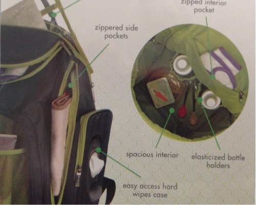 - Feature : Easy to carry with padded shoulder strapes / 11 organizer packet and zippered size pockets / changing pad and accessory pouch included / Easy access wipe case, wipes case included / interior bottle holder, Size 16"x14"x6"