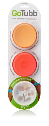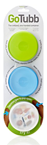 The GoTubb features an ingenious design that allows you to open and close it with one hand only. Just squeeze the sides and the lid is released. To close, simply press back on. For everything that you can’t squeeze out of a GoToob, there's GoTubb. GoTubbs work great with pills, knick-knacks, snacks, vitamins, change, bits-n-pieces, you name it. A recessed, textured labelling area resists being rubbed off. And the transparent tops let you see what’s inside without opening them. GoTubbs are food-safe (FDA), completely recycleable (#5 plastic), and they're 100% BPA-free, PC-free, and phthalate-free.