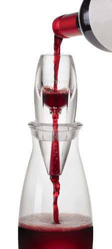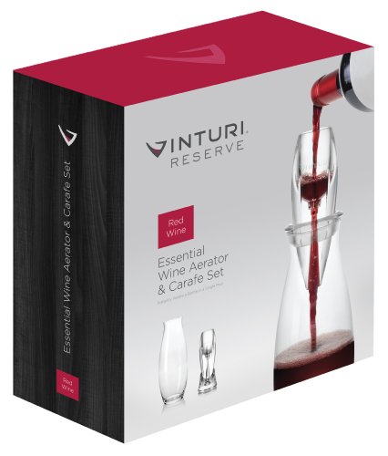 Studio : Harold Import Company, Inc. Publisher : Harold Import Company, Inc. Binding : Kitchen Product Description Vinturi's Reserve Essential Red Wine Aerator and Carafe Set opens up your wine and speeds up the aeration or breathing process and aerates a full 750ml bottle of wine directly into the carafe in less than 30 seconds. The carafe is perfect for serving wine at the table to family and guests. Enjoy a better bouquet, enhanced flavors and smoother finish, sooner! Vinturi's experience combines superior technology with timeless design that invigorates your senses. You know the Essential Red Wine Aerator is at work when you hear the unique sound of air being infused with your wine; a sound that can only be heard from the patented technology of the Vinturi. As the wine increases velocity, oxygen is drawn in through the air intake channels delivering the perfect glass of wine. The Reserve Essential Red Wine Aerator includes the FDA-approved acrylic Red Wine Aerator, a stand, a German-made glass carafe and an integrated carafe topper that connects the Red Wine Aerator with the custom-designed carafe. To clean your Vinturi Reserve Essential Red Wine Aerator and Carafe Set, simply hand wash or clean in the dishwasher. Both aerator and stand are dishwasher safe. Great to give as gifts for wine enthusiasts or as a hostess gift. 0