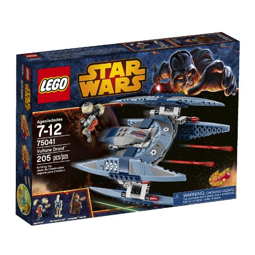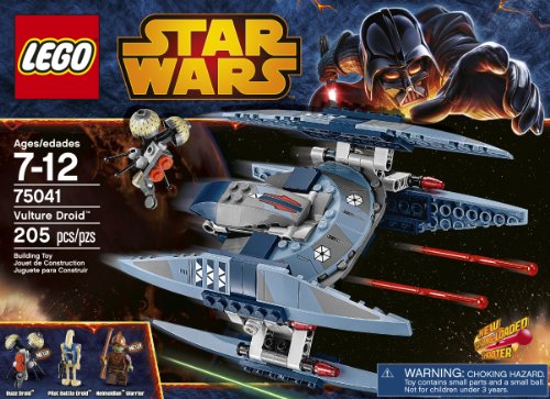-. Binding : Toy -. Brand : L.E.G.O -. EAN : 0673419210058 -. Edition : 1st -. Feature : Includes a Neimoidian Warrior minifigure plus a Buzz Droid and a Pilot Battle Droid figure with a blaster p.i.s.t.o.l / Features new dual sP.R.Ing-loaded shooters, flying/walking modes, possible head and space for a pilot / Recreate exciting battle scenes from Star Wars: Episode III Revenge of the Sith! Deploy the Buzz Droid and disable the enemy starfighters! / Transform from flying to walking mode! Load the new sP.R.Ing-loaded shooters and prepare to fire! / Combine with 75038 Jedi Interceptor for an epic space battle; Measures over 6" high, 3" long and 5" wide -. Genre : strategy -. ItemPartNumber : 6061120 -. Label : L.E.G.O -. LegalDisclaimer : ITEM HAS SMALL PARTS -. Manufacturer : L.E.G.O -. Model : 6061120 -. MPN : 6061120 -. PackageQuantity : 1 -. PartNumber : 6061120 -. ProductGroup : Toy -. ProductTypeName : TOYS_AND_GAMES -. Publisher : L.E.G.O -. ReleaseDate : 2014-03-01 -. Studio : L.E.G.O -. Title : L.E.G.O Star Wars 75041 Vulture Droid -. UPC : 673419210058 -. Warranty : No Warranty