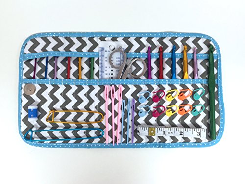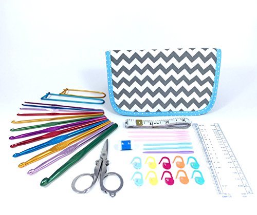 TenderHeart Shop Crochet Kit with Hook Set, Stitch Markers, Scissors, Yarn Needles, Measuring Tape, Safety Pins, Ruler, Gauge Measure and Row Counter, Grey Chevron Pattern
