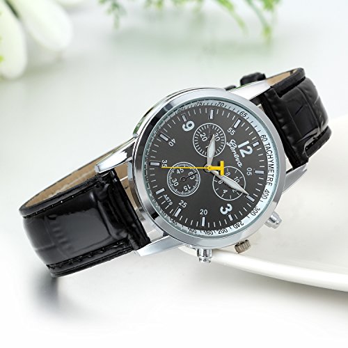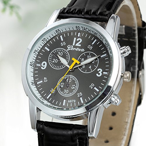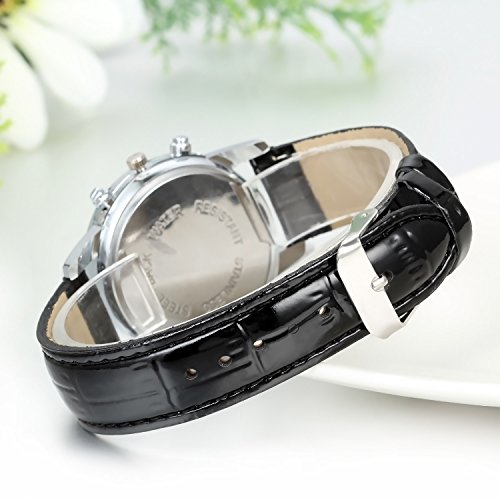 -. Feature : Round watch featuring easy reader dial / Silver tone case with mineral dial window / Quartz movement with analog display / Leather band with buckle closure, sub-dials are for decoration purpose only / Applicable gifts occasion: business affairs, Birthday, house-warming party