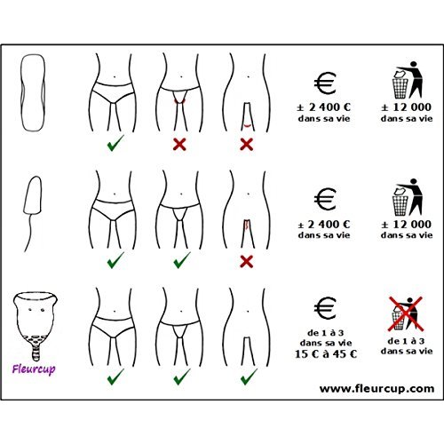 Studio : fleurcup Publisher : fleurcup Binding : Health and Beauty Product Description Menstrual cup, natural alternative to tampons and sanitary towels. Set of two fleurcups sizes. The only cup made in France. Cart of Allergy offers two storage pockets washable natural linen as well as apos; a booklet with tips apos; illustrated uses. Advantages: - Natural: made of medical grade silicone, no chemicals, no fragrance, no allergies - Clean: no waste to throw away, is easy to transport - Easy apos; use: high flexibility, easy insertion, can s apos; use the pool and playing sports - Easy maintenance: flushing morning and evening, sterilization between each cycle - Economic: a cup can be used for several years if properly maintained. The Fleurcup Large Size is well suited to women who have given birth or heavy periods. Dimensions: Diameter: 46 mm, height (excluding stem): 52 mm, total capacity: 35 ml working capacity (from the base to the holes for the apos; air): 29 ml, stem length: 18 mm. COLOURS OF CUPS ARE RANDOM AND DO NOT NECESSARILY MATCH THAT PHOTO he n apos; is not possible to choose colors. 0
