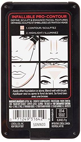 Get perfectly sculpted contours in 30 seconds. Now, contouring is made easy. With the pro-sculpt brush you can define, sculpt, and enhance your features like a pro. The infallible pro-contour palette has beautifully coordinated highlighting and contouring shades for a professionally-defined look. These buildable powders blend effortlessly into the skin for a flawless, fade-proof finish.Feature