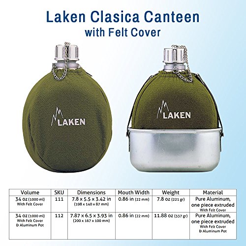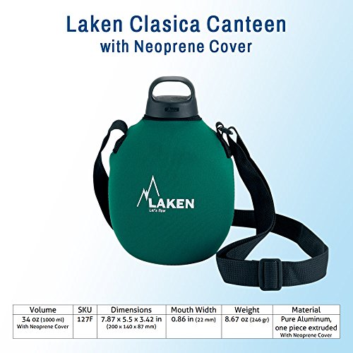 Product DescriptionClasica is Laken classic oval-shaped aluminium canteen with 34oz (one litre) capacity , for those who are thirst of adventure. Polyamide lining. With neoprene cover, with shoulder strap.0