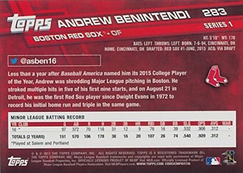 All Red Sox cards from series #1 and #2 including Andrew Benintendi Rookie card, Eduardo Rodriguez, Tyler Thornburg, David Price, Chris Young, Clay Buchholz, Drew Pomeranz, Jackie Bradley Jr, Dustin Pedroia (2 cards), Steven Wright, Blake Swihart, David Ortiz (2), Rick Porcello (2), Mookie Betts (2), Yoan Moncada, Henry Owens, Xander Bogaerts, Pablo Sandoval, Hanley Ramirez, Brock Holt, Craig Kimbrel and a Red Sox Team Card.