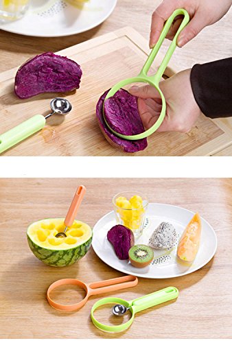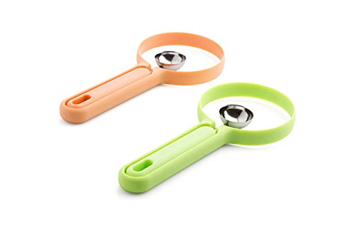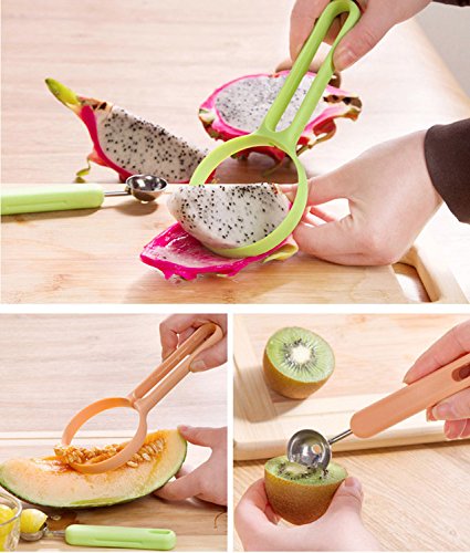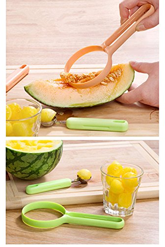 Studio : Viskey Publisher : Viskey Product Description Scoops for scooping out different sized melons or other fruits and vegetables. Blades delicately separate fruit from the rind. Remove seeds from tomatoes, bell peppers and other vegetables. Plastic with stainless steel handles. Size: 18cm x8cm. Material: Plastic stainless stee 0
