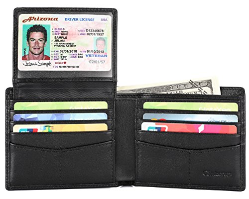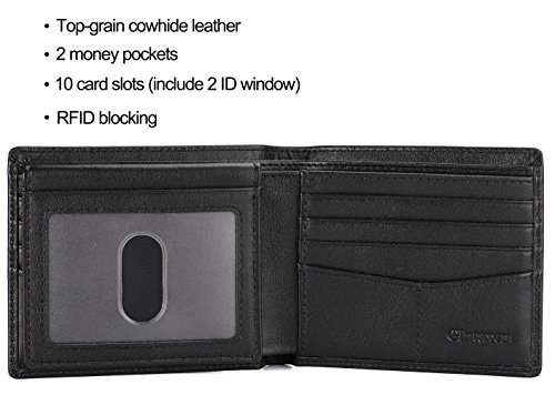 Features: - 100% Genuine leather - 2 ID window, 8 card slots, 2 hidden slots and 2 cash pockets - Size: L4.4 x W3.6 x H0.4 inches (11.2 x 9.2 x 1cm) - RFID signal blocking - Covered by our 2 years warranty What is RFID? - RFID: Radio-frequency identification, uses electromagnetic fields to automatically identify and track tags attached to objects. The tags contain electronically stored information. Our Credit/Bank/ID card, passport have encoded chips tags, and stored our personal/private information. So, we should protect them from information hacker and data thieves. - Data thieves can read your private data of cards at a distance of 10ft(3m), using a RFID scanner. Now, this RFID signal blocking wallet can protect your personal/private information safety. - This item has built-in RFID signal blocking material layers, which can block signal from 10MHz to 30GHz. Credit/Debit/ID card, driver license, passport use the frequency of 13.56MHz. It won't block signal from ID badge, some old hotel room cards or building access cards, which use a frequency of 125 kHz. TIP: - Due to the monitor and light difference, the color will be slightly different with the pictures. - Logo prints and package maybe a little different with pictures.