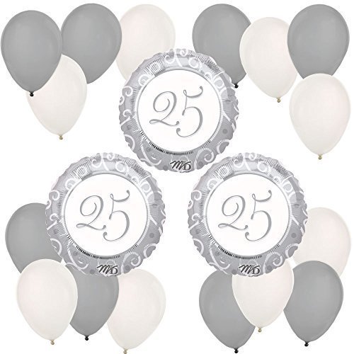 Make a statement at your next party with the 25th Anniversary Balloon Kit! This kit contains 18" round 25th mylar balloons with and a 16 pack of 11" 8 white and 8 silver latex balloons. Balloons are a perfect and inexpensive way to add color and fun to your next event. The shaped balloon requires helium to be blown up and the latex balloons can be inflated using helium or blown up with air. Easy, simple party decorations for your 25th anniversary party.