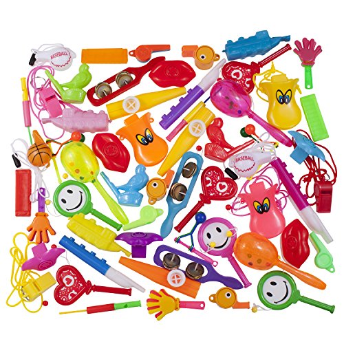 whistles and party noisemaker assortment pack of 60 pieces combination of 20 different party whistle types, including hand clappers, lip whistles, slide whistle, mustache whistles, mini train, maracas sticks, cymbals toy, kazoo, and much more kids toy noise makers. great for party favors, party activity and giveaways, as well as for a school classroom party or rewards event, carnivals and all other occasions such as birthday and holiday gifts. Assembled and sold Exclusively by: SMART NOVELTY.