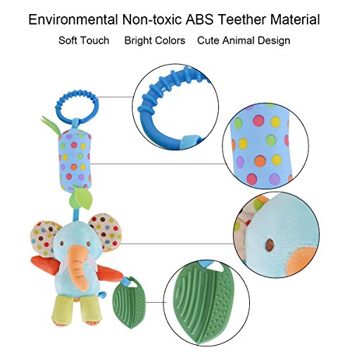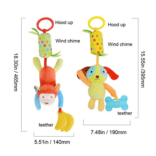 PERFECT COMBINATION AND SOFT VOICE TO ATTRACT BABY-Come with 4 different animal toys (includes elephant, owl, dog, monkey). Each hanging car seat toy has built-in wind chime which makes a soft, cozy and soothing sound by gentle shake, help parents to play with babies and help to stimulate your babies muscle and develop grab ability. Colorful, peculiar shape, very strange and interesting, stimulate the children's sensory development.