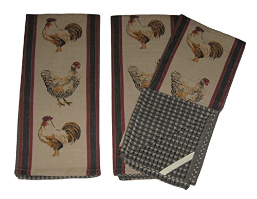 Rooster Chicken Tan Black Burgundy Red Cotton Kitchen Dish Towel Set (3 Items)